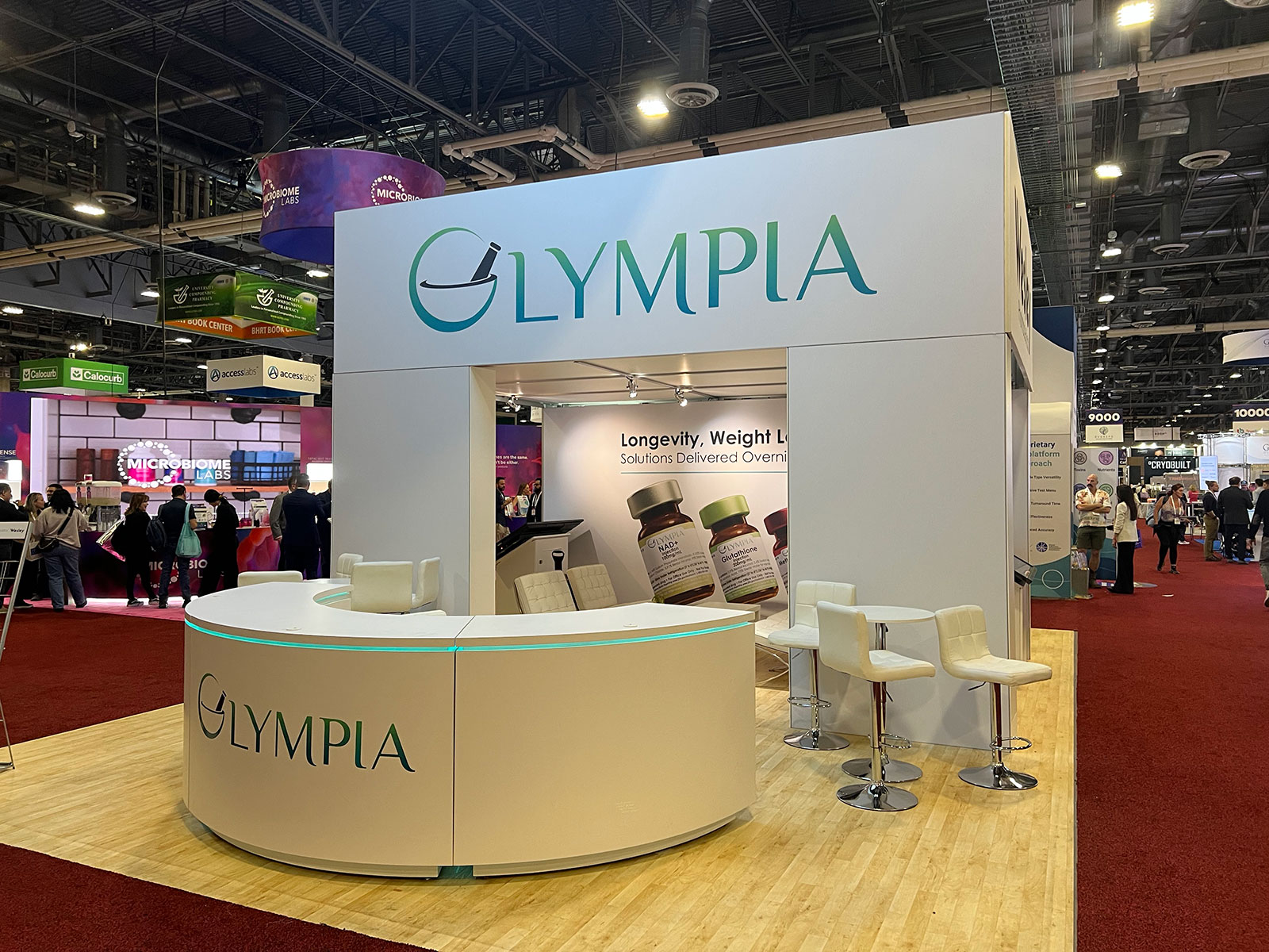 Custom Symphony Portable SYK-1038 Display with Fabric and Direct Print Graphics, Shelves, Rainbox Aero Tube Frame, LED Accent Lights, Monitor Mount, Square Reception Counter, and Small Bistro Table [ORD-68672]